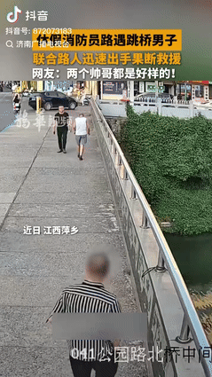 “这俩小伙火了!”江西萍乡,一男子翻越大桥护栏想要跳河,路过的小伙发现后,迅速抱住其大腿阻止行动,但因力量有限,没法把男子抱下来,小伙急忙出言安慰,男子警戒性慢慢放低,正在休假的消防员看到后,一把将其拽到安全区域,网友:救人一命胜造七级浮屠!